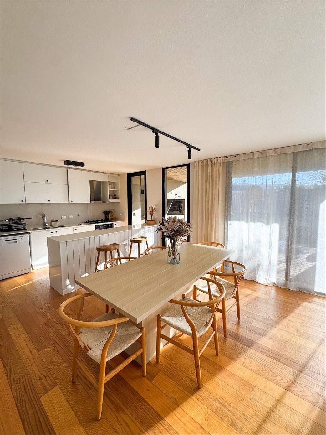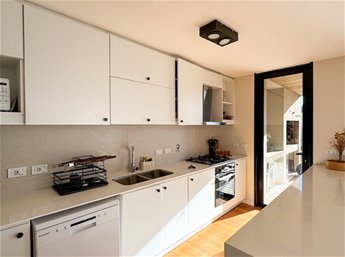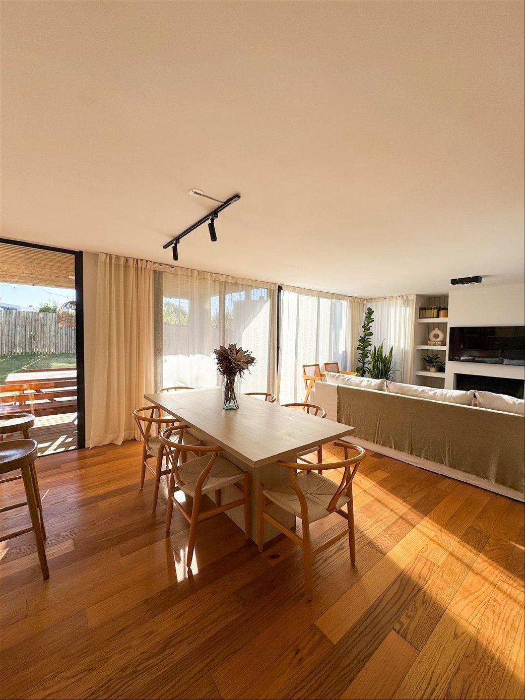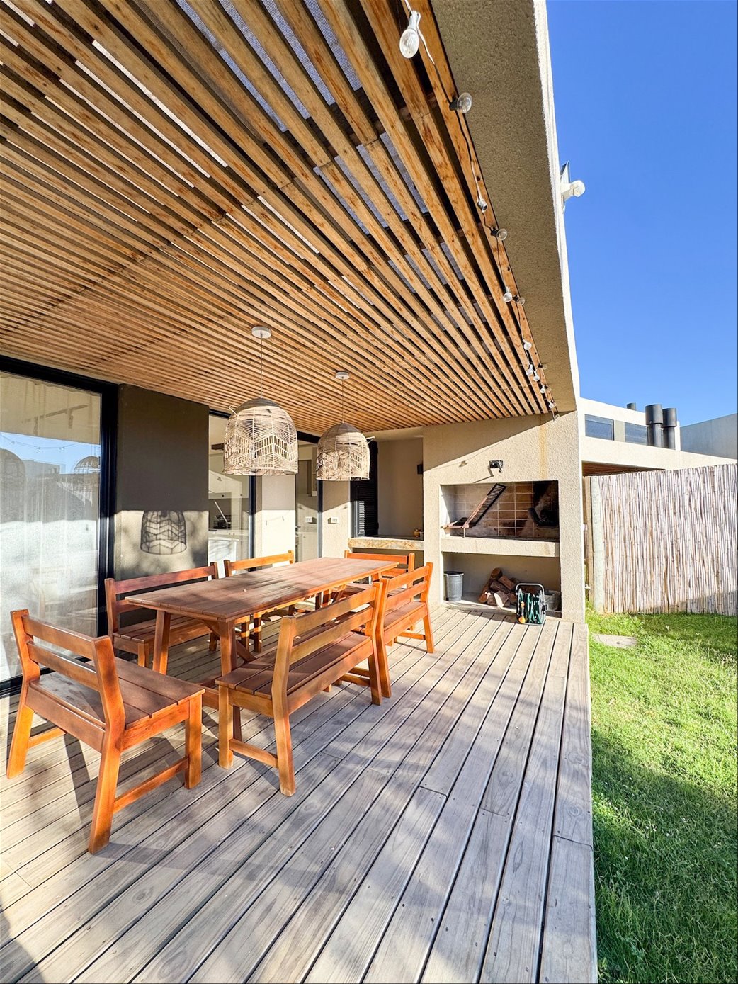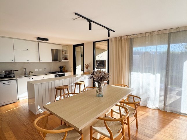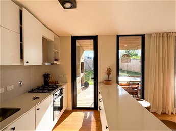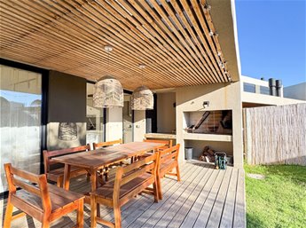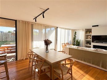 En planta baja, la casa cuenta con un living comedor con estufa a leña, excelentes dimensiones y luminosidad, cocina integrada completamente equipada, baño social. En el exterior encontramos una pergola con parrillero y jardín con acceso a la piscina.
