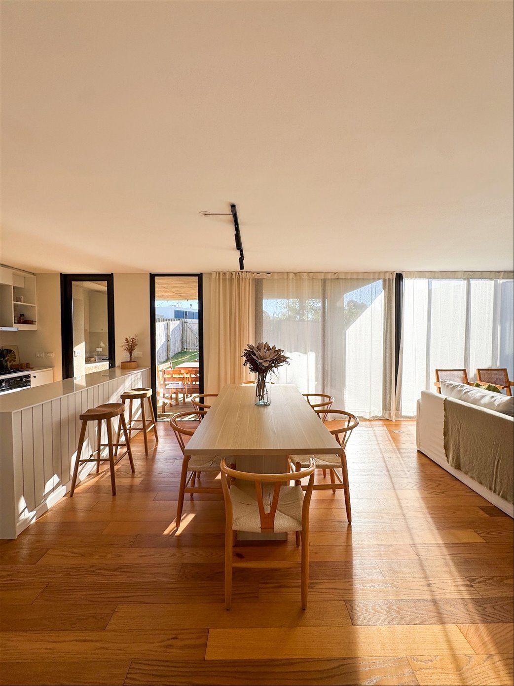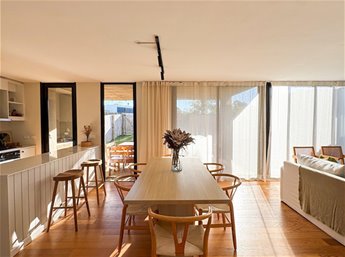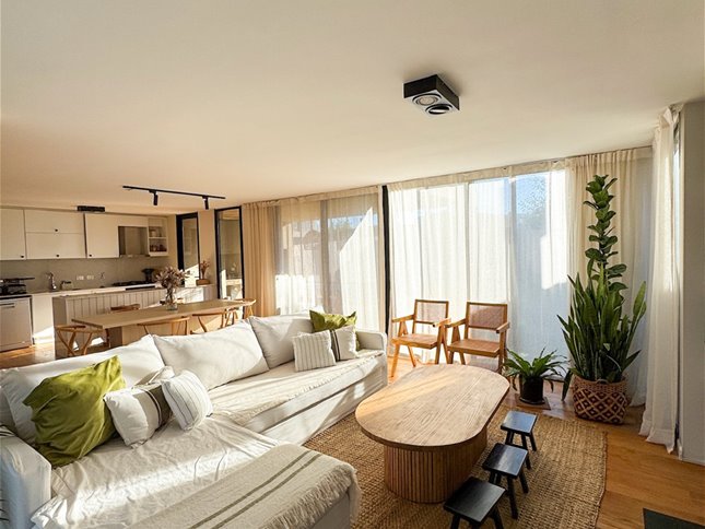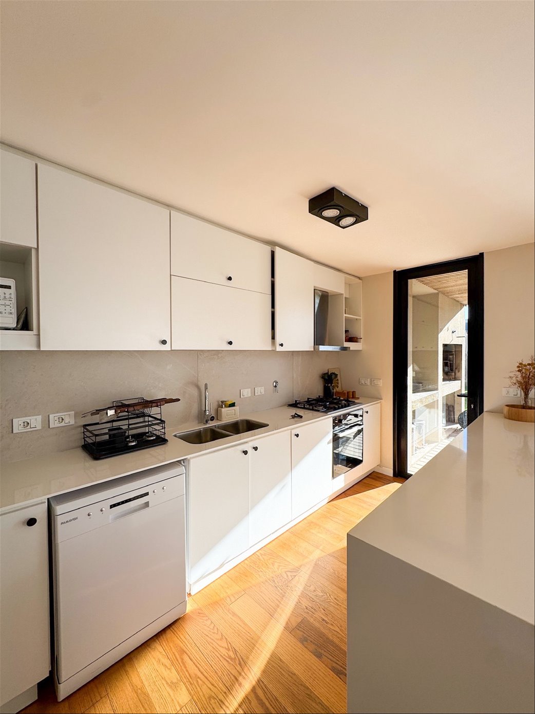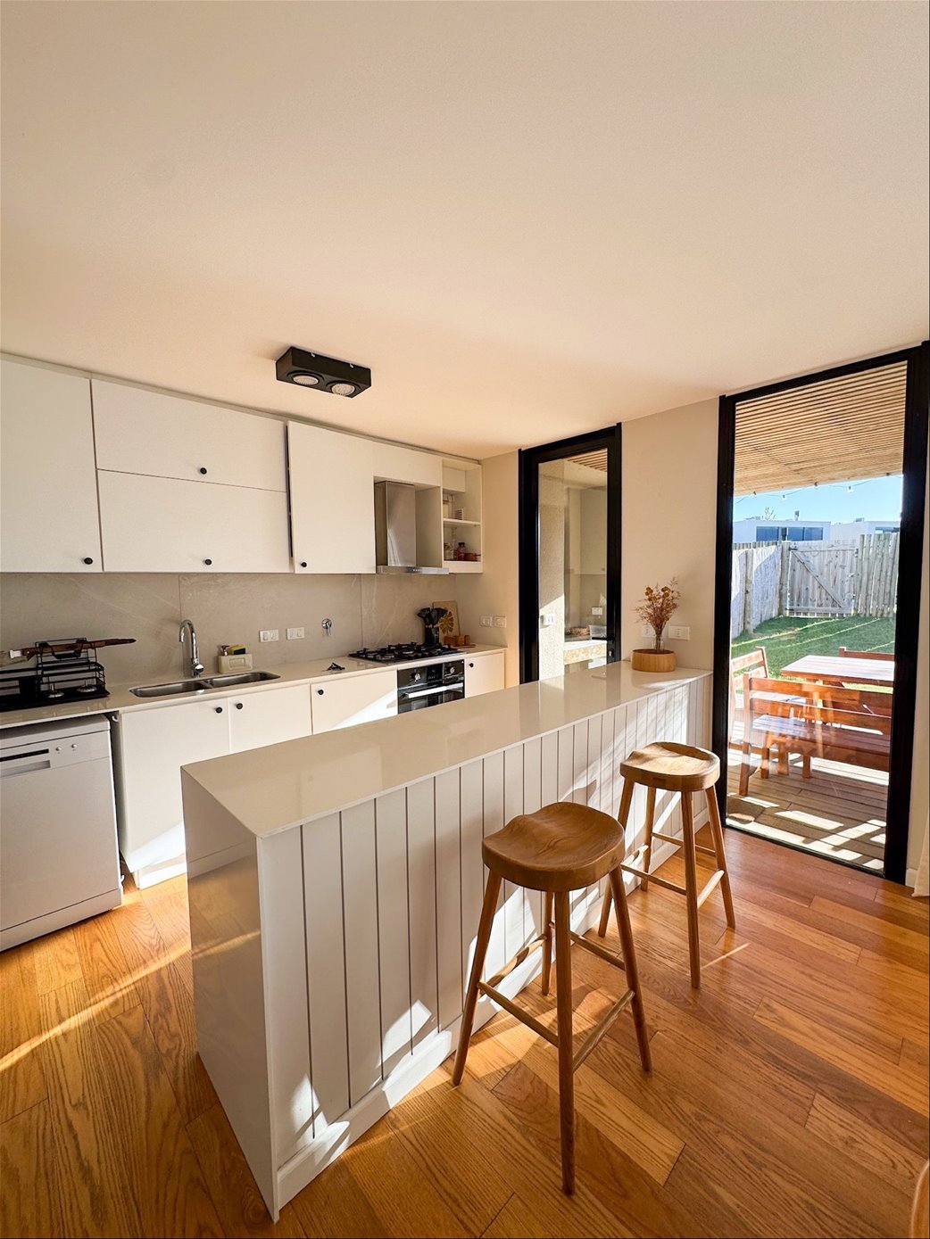 En planta baja, la casa cuenta con un living comedor con estufa a leña, excelentes dimensiones y luminosidad, cocina integrada completamente equipada, baño social. En el exterior encontramos una pergola con parrillero y jardín con acceso a la piscina.