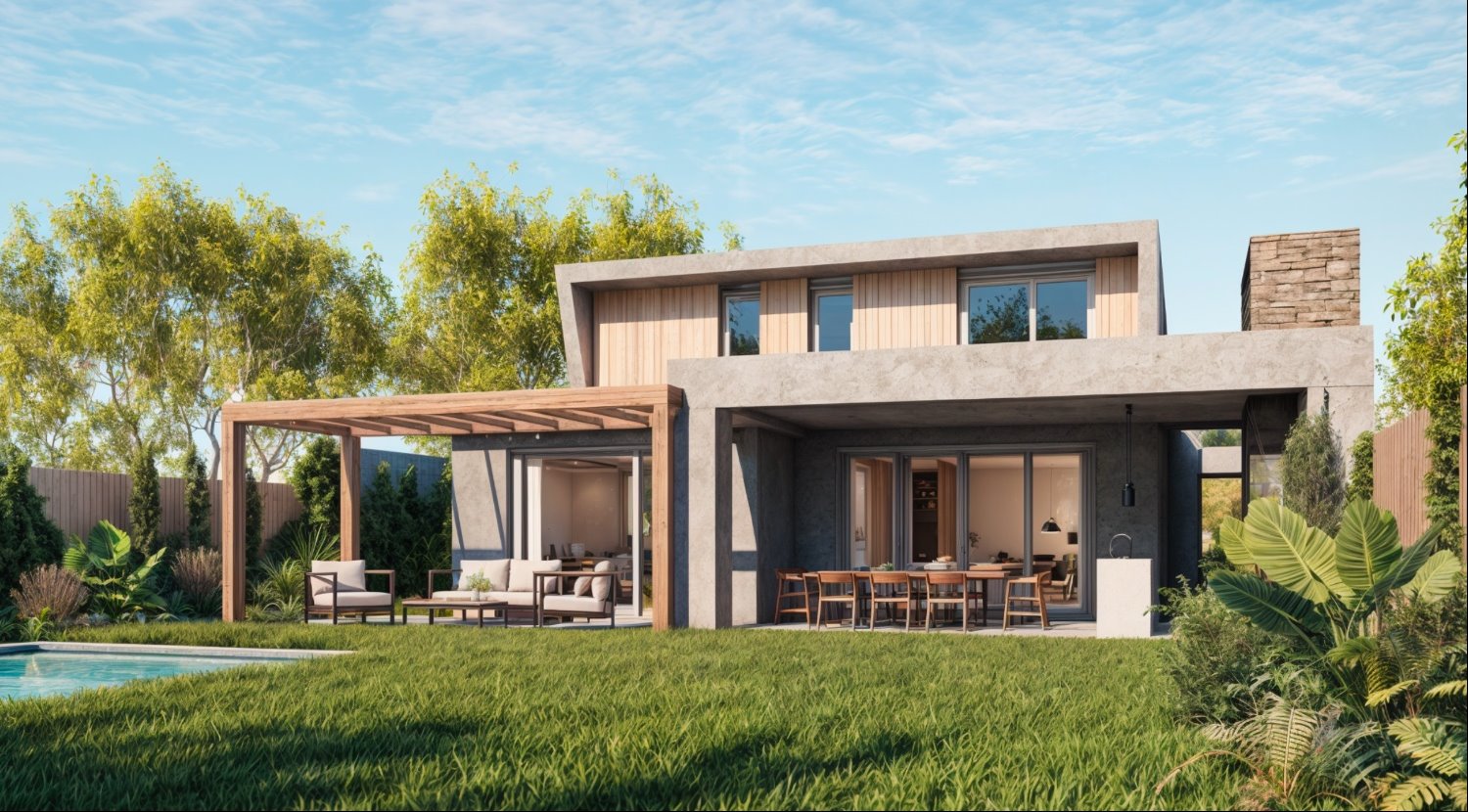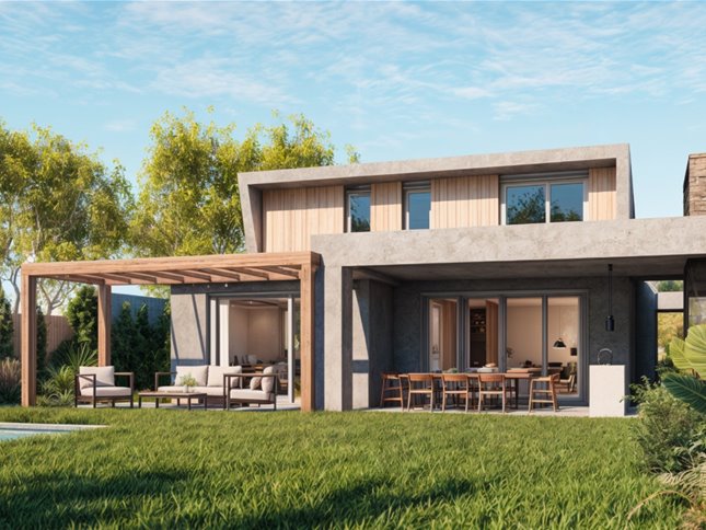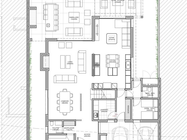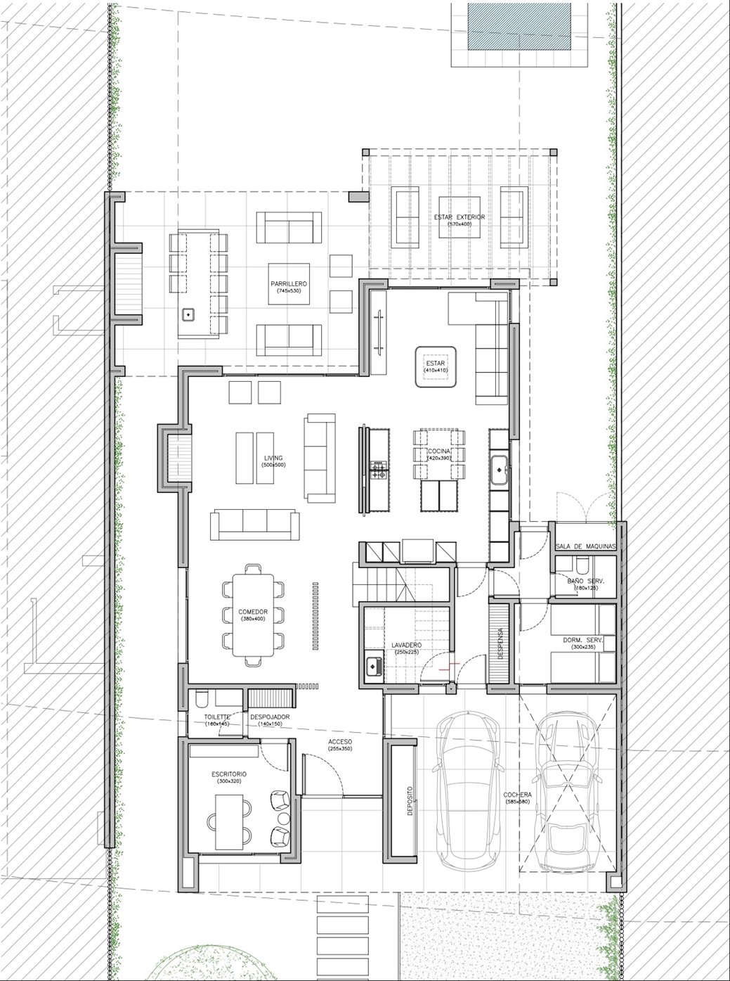 Estar exterior semicubierto, piscina, cochera techada para dos autos y depósito.