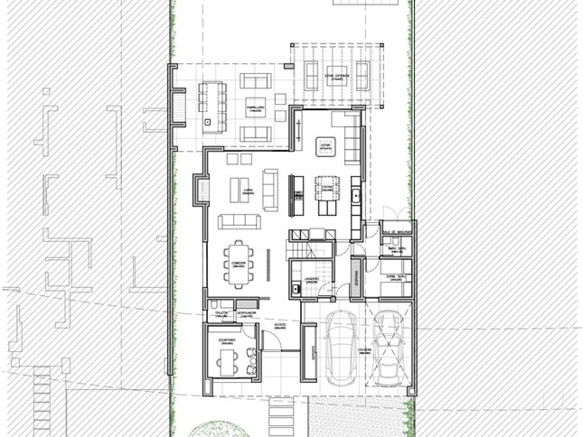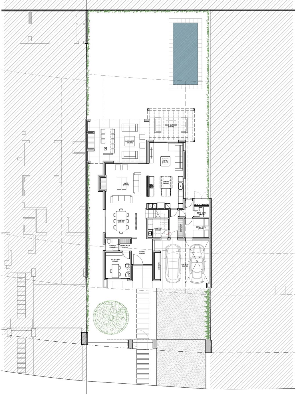 Hall de entrada con despojador, escritorio, toilette, gran living comedor con estufa a leña y cocina con isla integrada al estar diario. Desde estos ambientes se accede a una galería techada con parrillero. Área de servicio completa y sala de máquinas.