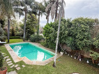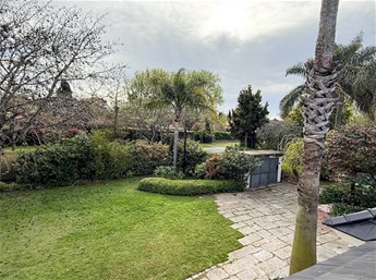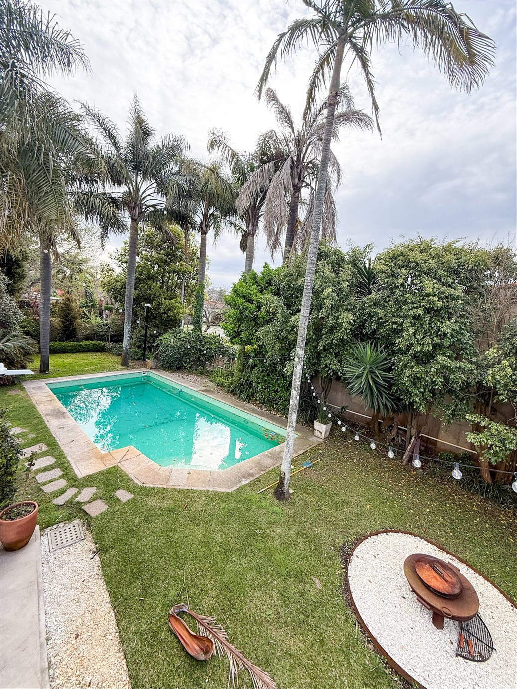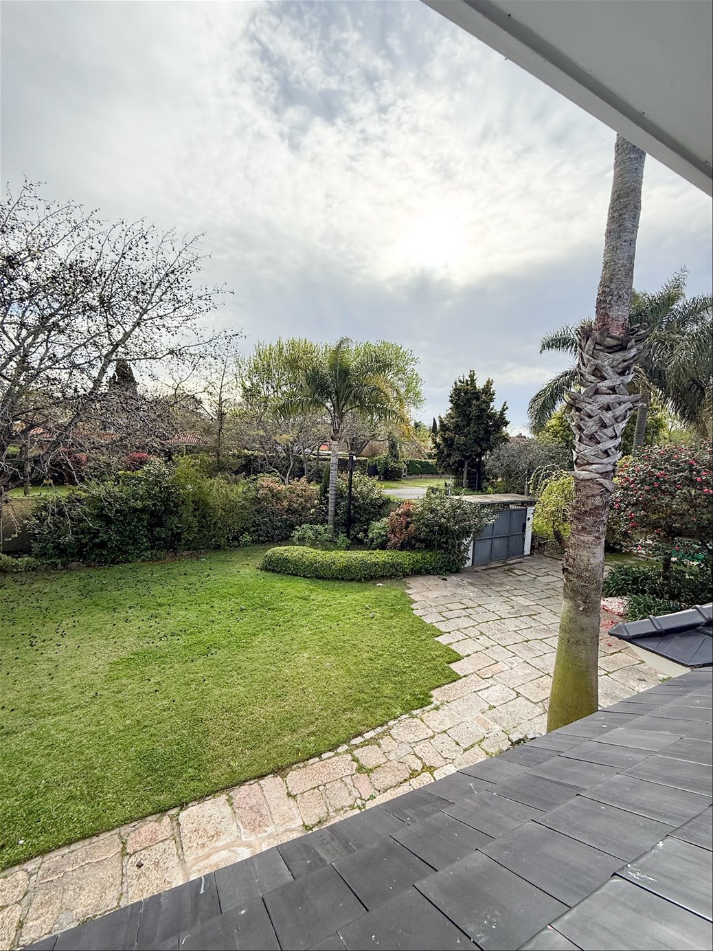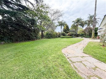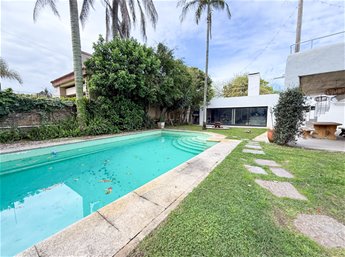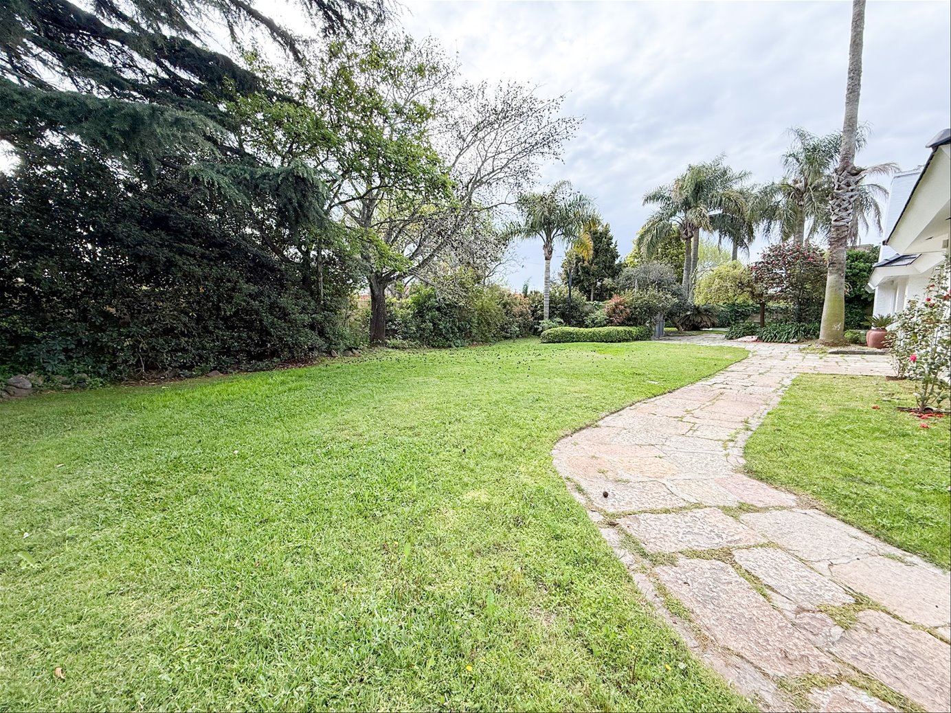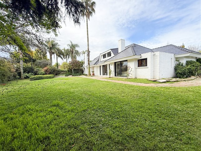 La casa se ubica en esquina, con acceso peatonal y vehicular desde distintas calles. Dispone de estacionamiento para 5 autos, piscina, jardín parquizado con palmeras y huerta, además de una barbacoa con parrillero.